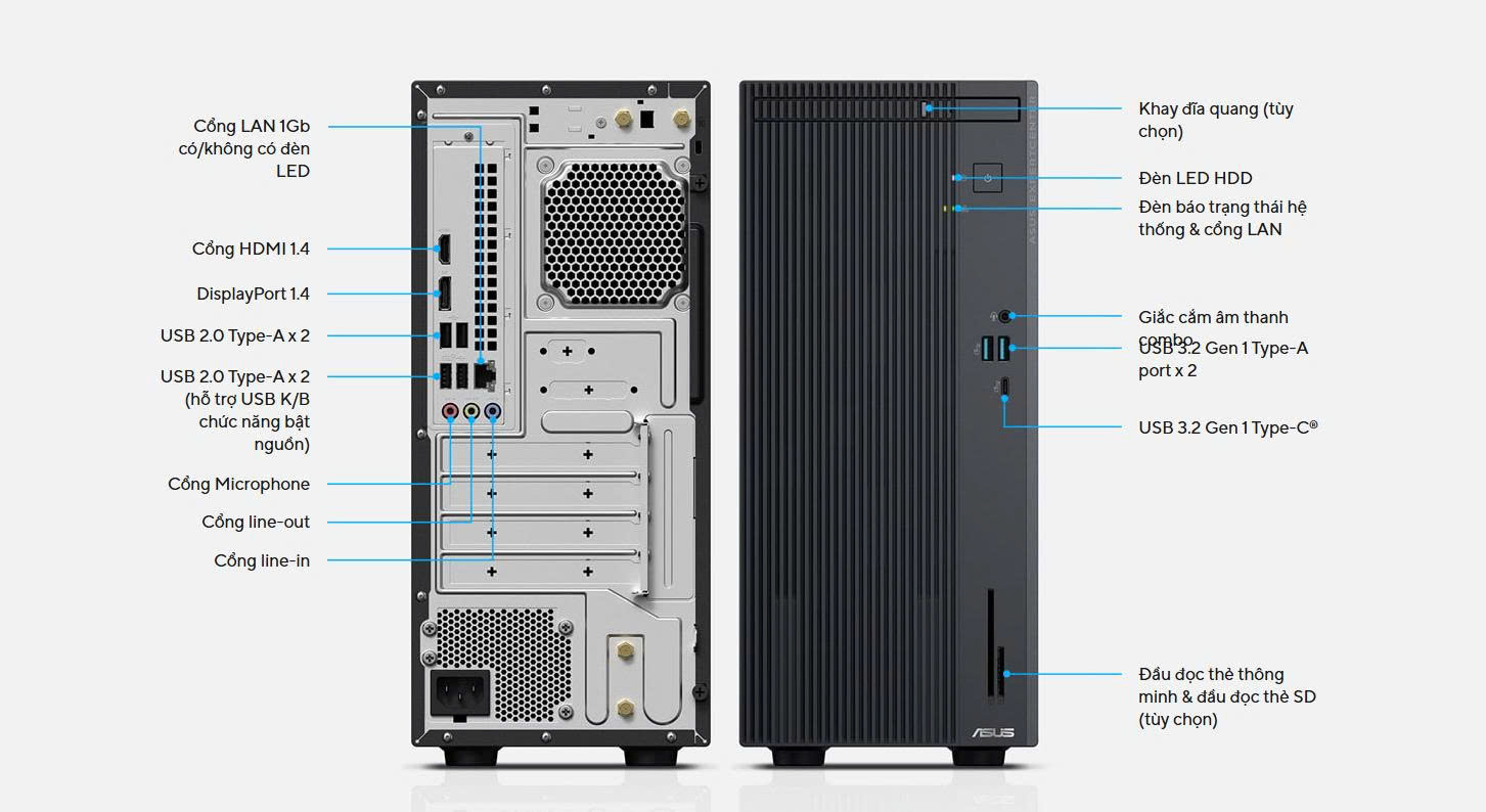 Cổng I/O toàn diện: Máy có đầy đủ các cổng kết nối quan trọng ở cả mặt trước và sau, bao gồm USB Type-C, HDMI, DisplayPort, cổng LAN Gigabit Ethernet và nhiều cổng USB-A (cả 3.2 và 2.0), cho phép kết nối đa màn hình và thiết bị ngoại vi dễ dàng.